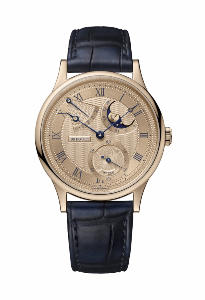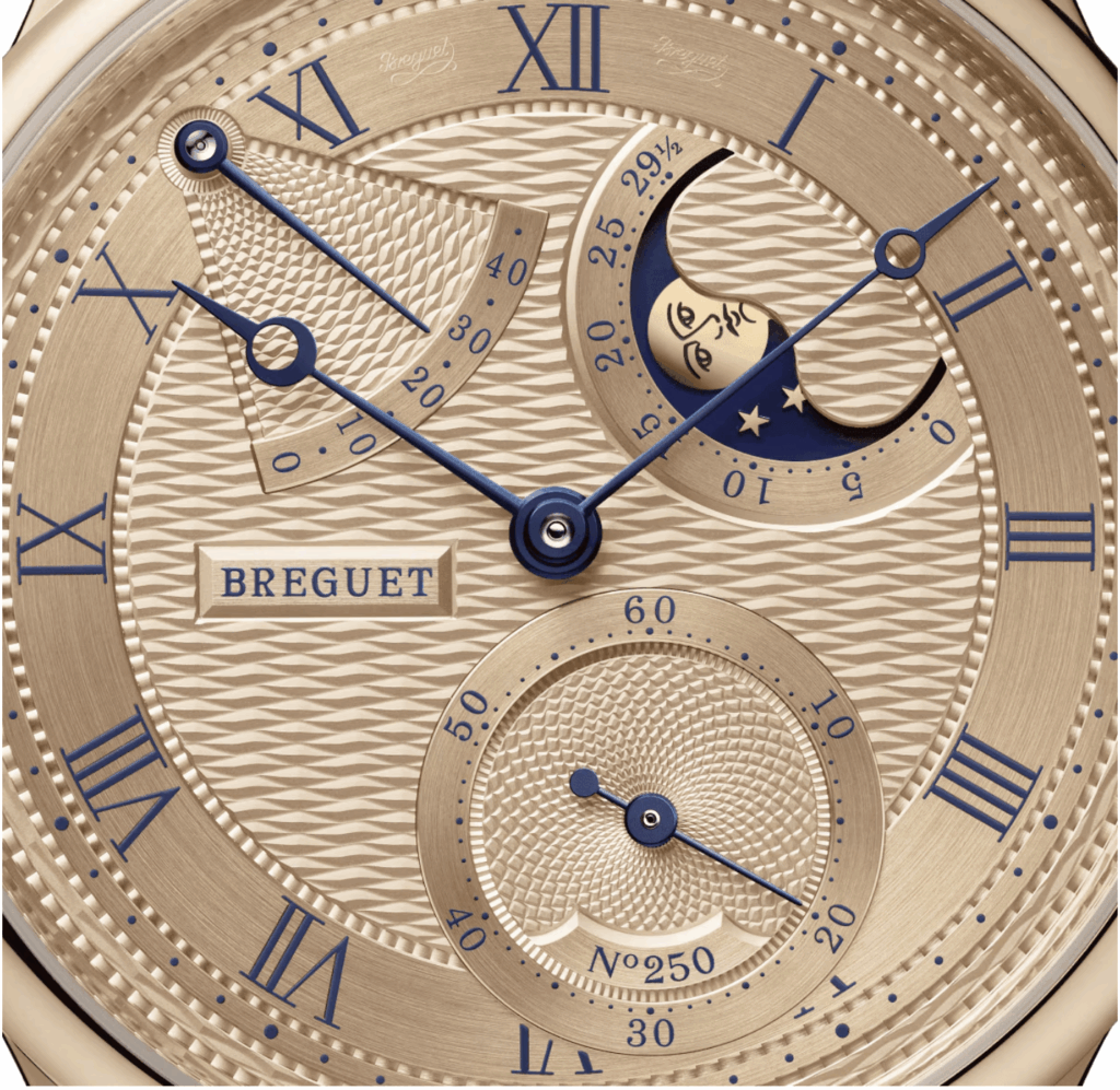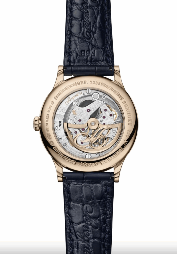 Pour ses 250 ans, la Manufacture Breguet dévoile progressivement des créations qui mettent un accent particulier sur la finition. La Classique 7235 ne fait pas exception. Elle est réalisée en or Breguet 18 carats. Le précieux alliage habille également le cadran. Ce dernier comporte le guilloché main du motif « Quai de l’Horloge », adresse historique d’A.-L. Breguet à Paris. Le secteur de la réserve de marche et de la petite seconde, de même que le pourtour du cadran présentent un même motif, mais circulaire. Ils permettent de les discerner avec une plus grande acuité. La Lune, à 2h, est la reproduction exacte de celle qui figure sur la montre N°5 de 1794. Elle est aussi réalisée en or Breguet.