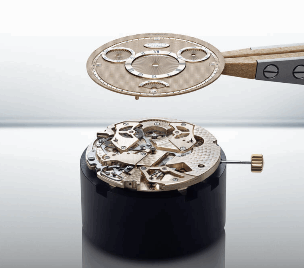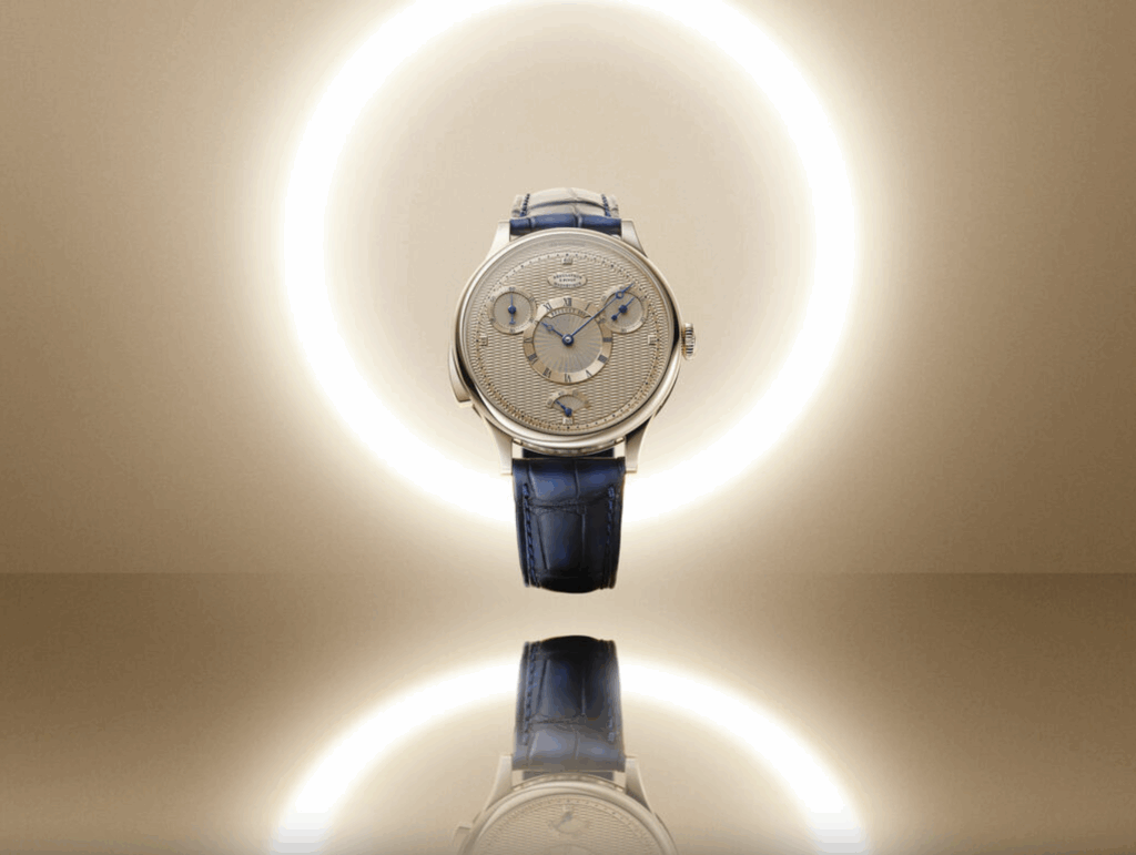 Côté cadran, la pièce reprend les complications de la montre N°5, ainsi que leur disposition générale : deux aiguilles centrales, réserve de marche à 10h30, phase de Lune à 2h, et petite seconde à 5h. Ses complications se distribuaient avec grâce sur des cadrans sans cesse réinventés – tous uniques, mais unis par ce sens inné de l’équilibre et de la justesse.