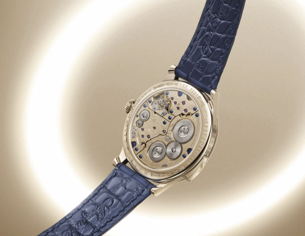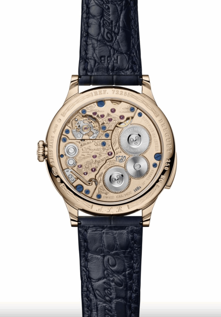Côté mouvement, Breguet a créé en 2025 un nouveau calibre pour animer la Classique 7235. Il s’agit du 502.3.DRL, avec spiral en silicium. Avant même ces complications, notons qu’il est automatique. La mention peut sembler anodine. Elle ne l’est pas : la montre N°5 de 1794 l’était également.