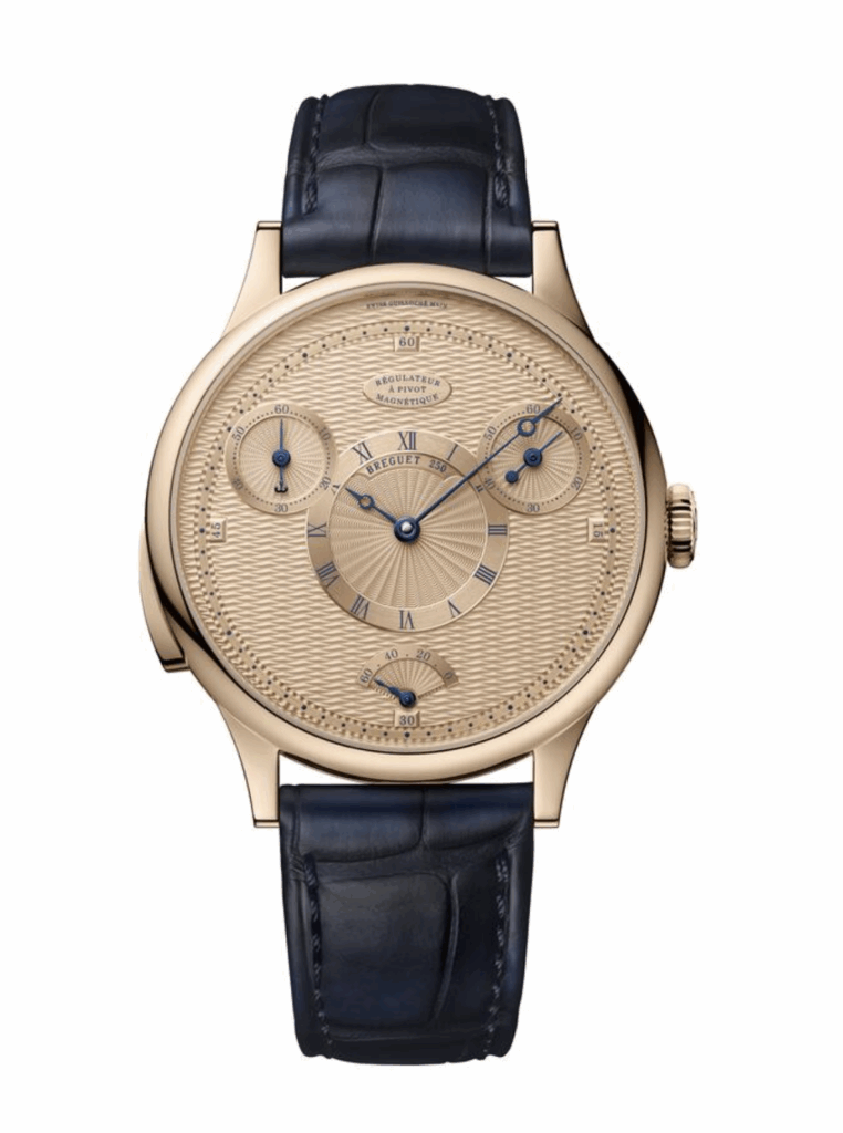 Matière Or Breguet 18K – Forme Ronde – Largeur 41 mm – Épaisseur 10.7 mm – Fond saphir – Entre-cornes 20 mm crown – Couronne non vissée – Water resistance – Bracelet matière Alligator – Étanchéité 3 BAR – Mouvement 74SC – Réserve de marche 60 heures.