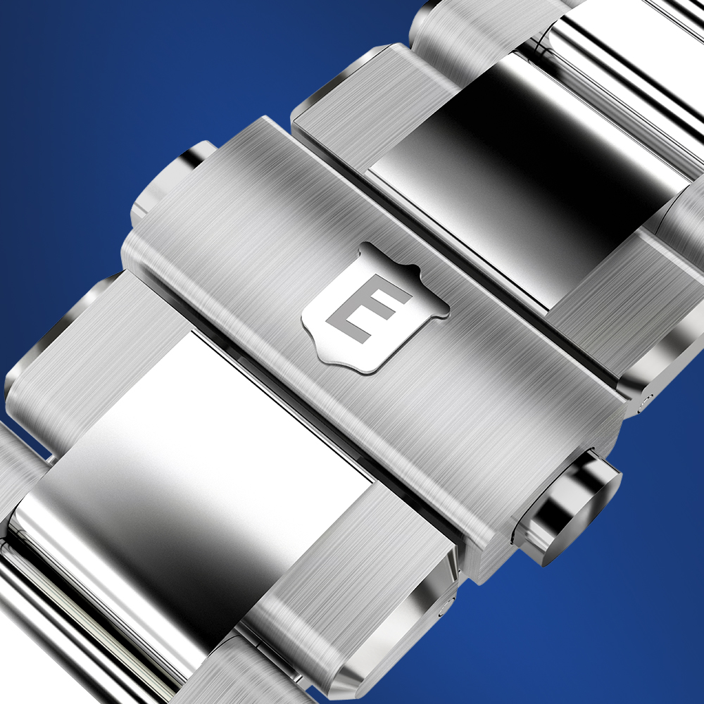 Proposé avec un cadran travaillé alternant finitions soleil et azurées, le modèle est exclusivement conçu avec un bracelet intégré en acier, avec surfaces polies et satinées, et doté de la fermeture exclusive à double poussoir 2CLICK.