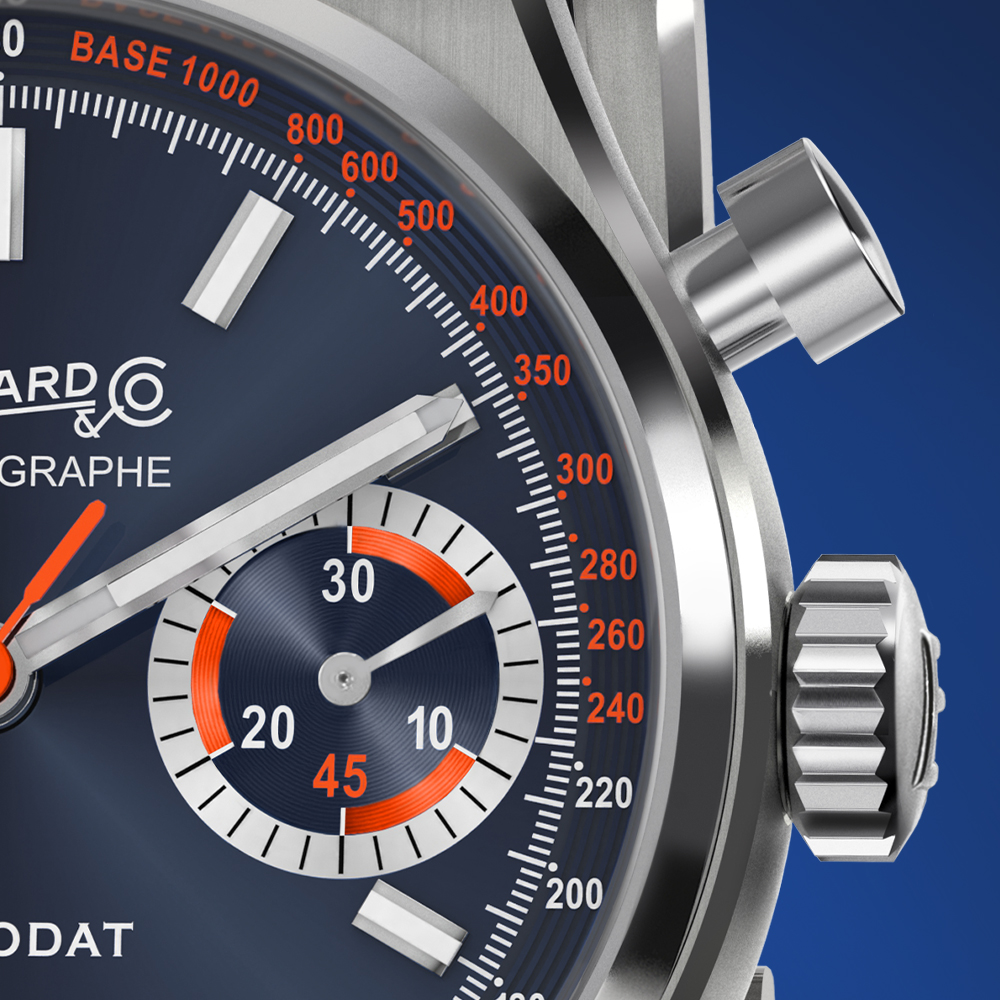 Son cadran se distingue par un jeu de symétries soigné et des éléments qui évoquent directement l’esthétique vintage : l’aiguille centrale du chronographe de couleur orange vif, le guichet de date trapézoïdal, ainsi qu’une échelle spécifique qui permet une lecture prolongée jusqu’à 45 minutes sur le compteur à 3 heures.