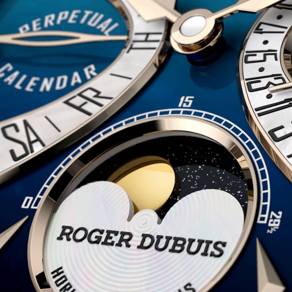 Lancé en 1999, le module RD72 présente la complication préférée de M. Roger Dubuis : le Calendrier Perpétuel. Pour cette édition anniversaire, de nombreux composants originaux du module RD72 ont été refabriqués conformément au brevet de 1989 cosigné par M. Roger Dubuis et le designer Jean-Marc Wiederrecht, réunissant le jour, la date, le mois, l’année bissextile et la phase de lune dans l’affichage birétrograde signature.