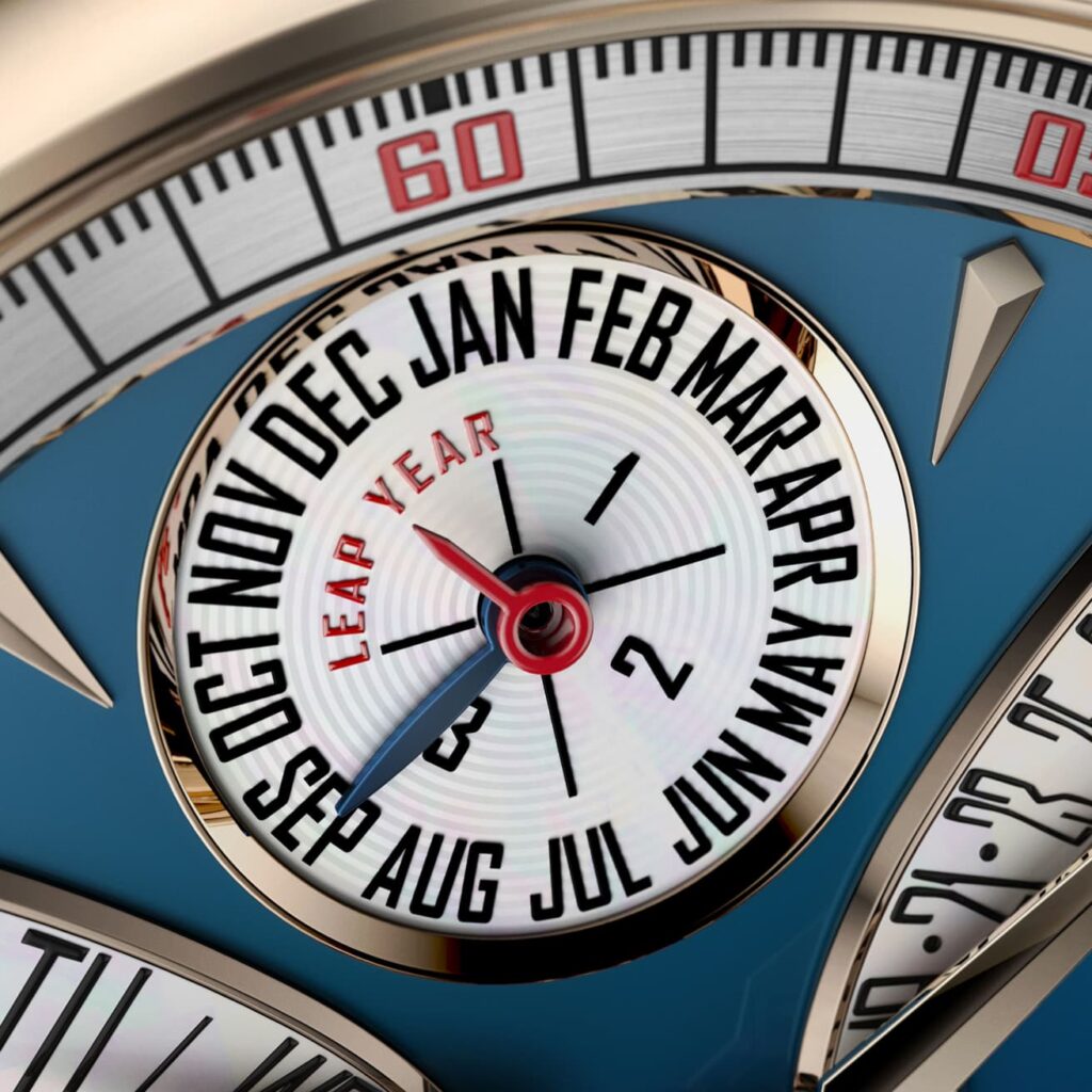 L’esthétique expressive est au cœur de la Maison. L’affichage Birétrograde trace un arc avec l’aiguille se déplaçant et revenant à zéro à la fin de chaque cycle. Autour de lui, un jeu de profondeur et de lumière se déploie sur cinq couches, chacune révélant une facette de l’art de la Maison.